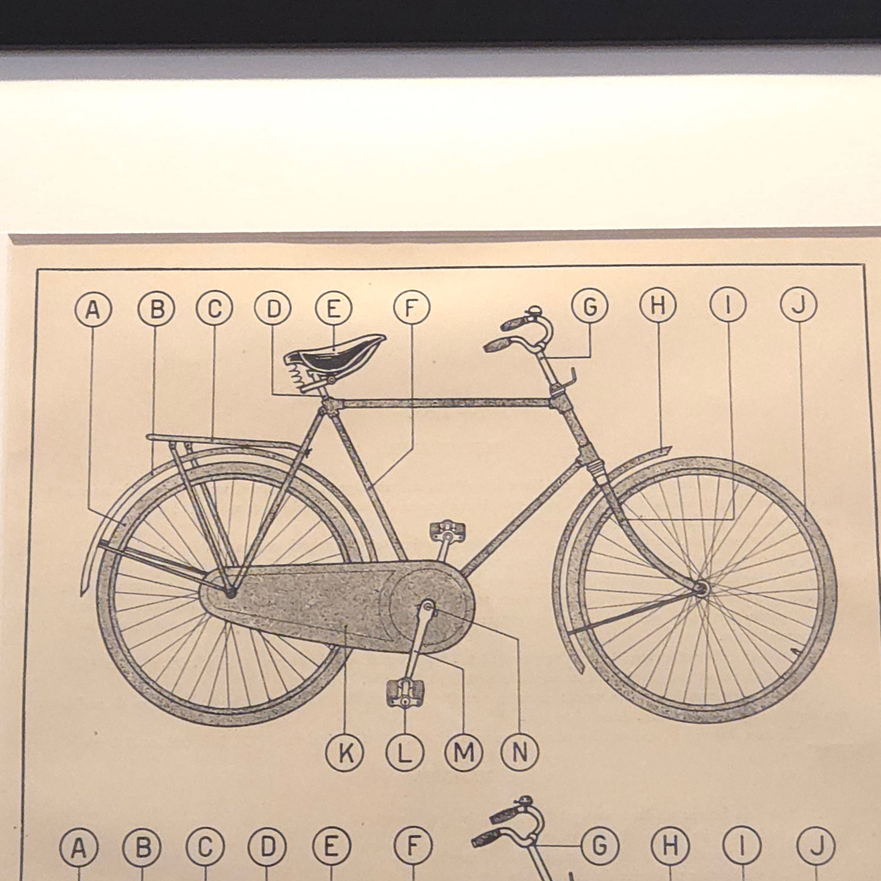 A beautifully preserved nod to Dutch industrial design, this vintage bicycle schematic presents two classic bicycle profiles rendered in crisp technical linework and labeled in Dutch. With the restrained palette of aged paper and ink, the print reads like a mid-century workshop blueprint — an elegant study in form, engineering, and everyday design. Ideal for the collector who is seeking to add to their minimalist, industrial, or mid-century decor aesthetic. This piece was sourced in the city of Amsterdam, where travel by bike is the de-facto choice for transportation within the city, and is perfect for any cycling enthusiast.