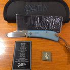 Handcrafted by renowned custom knife maker Javi Garcia, this Lanny’s Clip model showcases exceptional attention to detail. Built on May 30, 2023, it features a CPM 154 blade with a hand-rubbed satin finish, paired with a Jade G10 handle and Cobalt Blue G10 liner for a striking aesthetic and comfortable grip. The knife is accented with a dual milled federal shield, Steve Kelly pivot, and bead-blasted titanium hardware, finished with a leather hand-tied brown lanyard for a refined touch.
