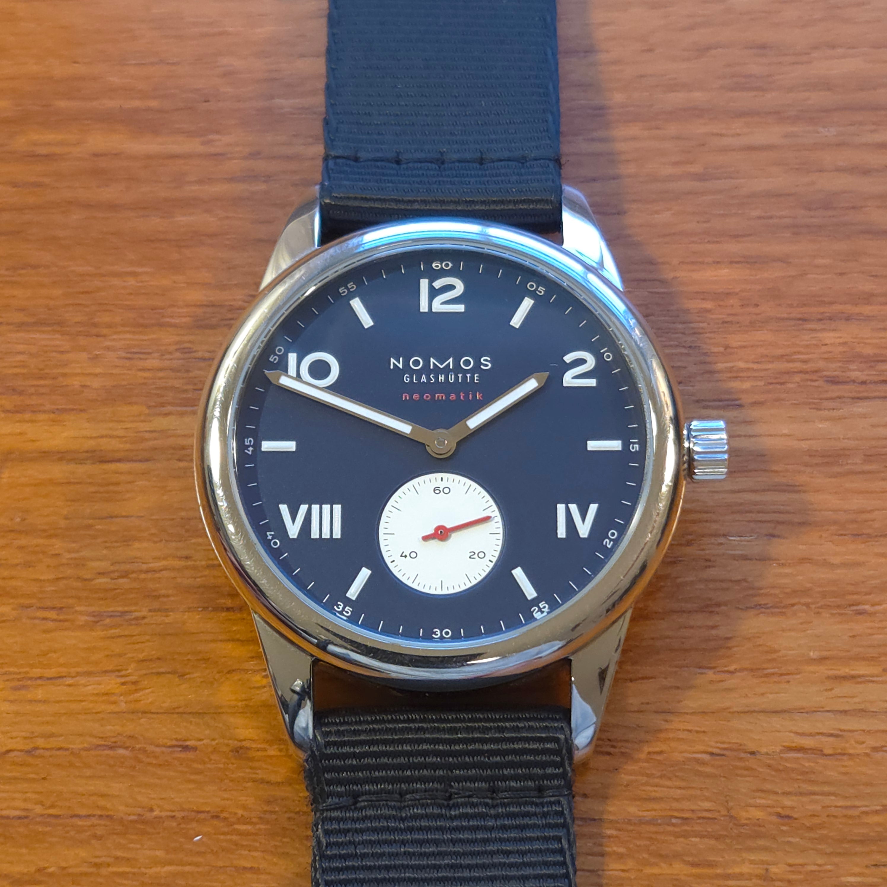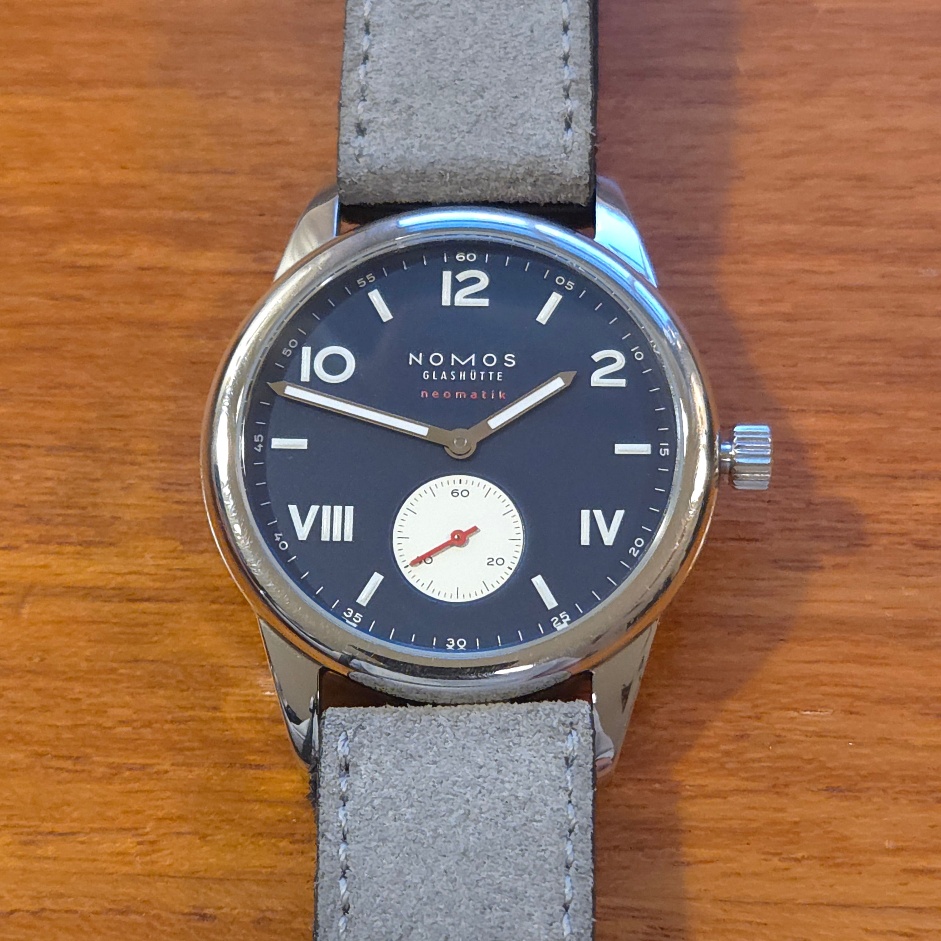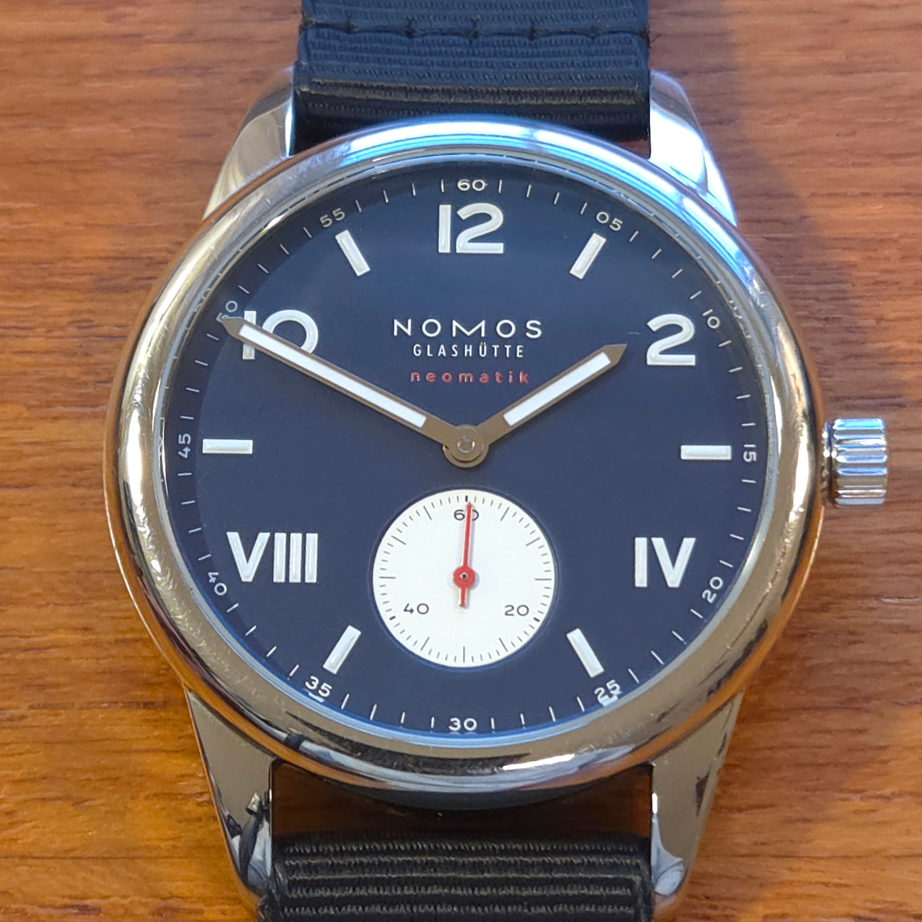 What makes this piece even more special is its pairing of the Club Campus dial configuration with NOMOS’s in-house DUW 3001 automatic caliber, visible through the sapphire caseback. Slim, precise, and beautifully finished, this movement represents the pinnacle of German watchmaking. This watch comes as a full kit, including OEM textile and leather straps, original packaging, leather NOMOS zip case, warranty paperwork, manual, microfiber cloth, and even photos of the watchmakers who assembled and regulated the movement. Condition is excellent, with only minor hairline marks on the polished case—typical for high-polish surfaces—while the dial, hands, and crystal remain pristine.