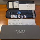 - Box: Yes (outer box and leather NOMOS zip case)