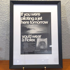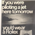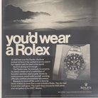 A striking artifact of mid-century horological history, this vintage Rolex GMT advertisement captures the elegance and precision of one of the world’s most iconic timepieces. Rendered in rich monochrome with period typography, the print evokes the golden age of travel and technical mastery — a visual celebration of design that bridged continents and defined an era of sophistication.