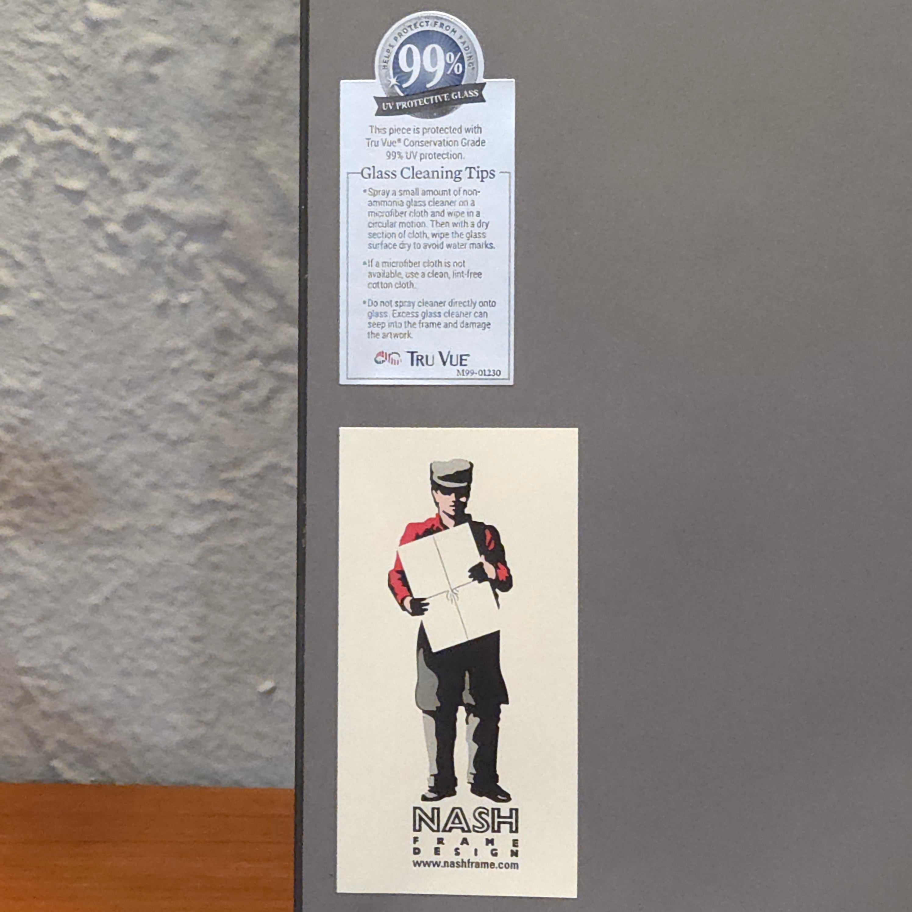 - Framing: Professionally framed by Nash Frame Design, Minneapolis; matte black frame with white museum mat